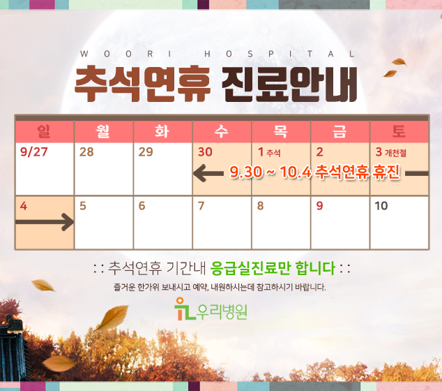추석연휴 진료안내 페이지 정보 작성자 최고관리자 댓글 0건 조회 3,470회 작성일 20-09-29 17:07 본문 추석연휴 진료안내 목록 이전글응급실(야간진료실) 진료시간 변경안내 21.01.12 다음글지금 국가암검진 받으세요! 20.07.13 댓글목록 댓글목록 등록된 댓글이 없습니다.
